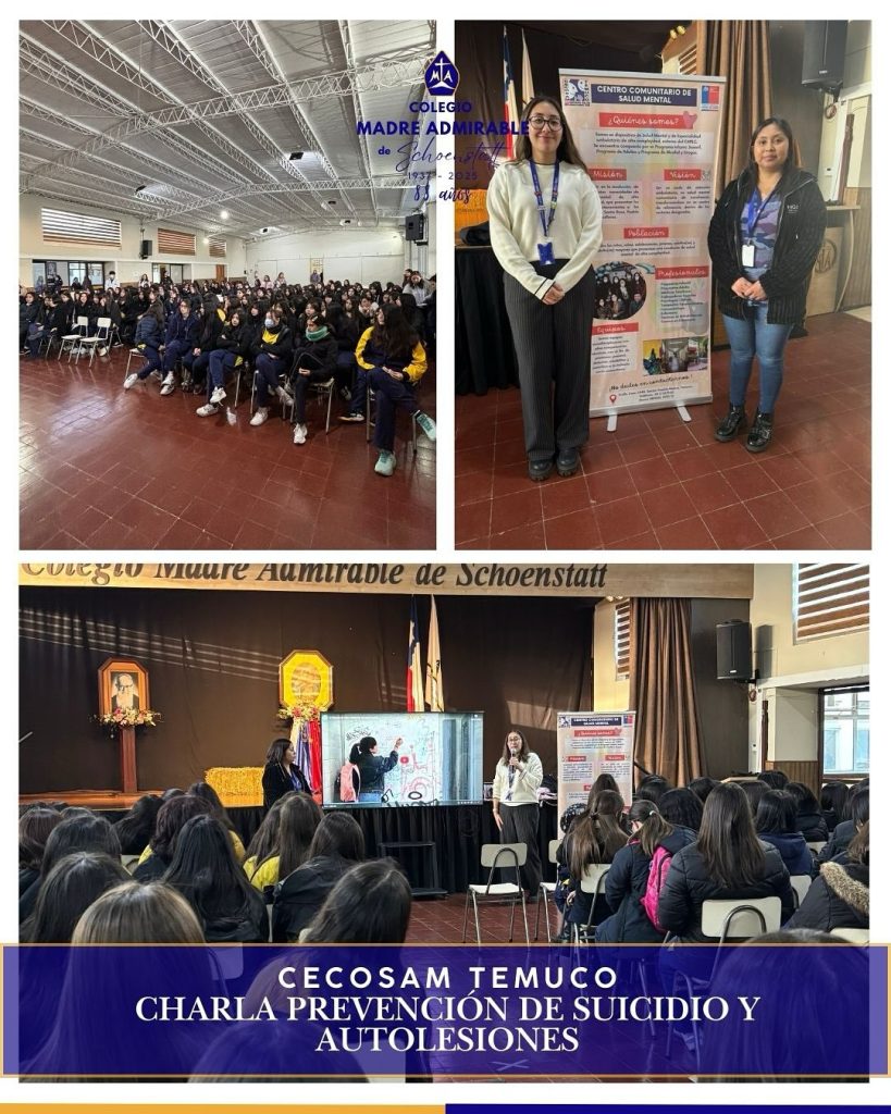 El pasado viernes 26 de septiembre, en el marco del Mes de la Prevención del Suicidio, nuestros estudiantes de Enseñanza Media participaron de una valiosa charla realizada por el Cecosam de Pueblo Nuevo y organizada por nuestro equipo de Convivencia Escolar.
