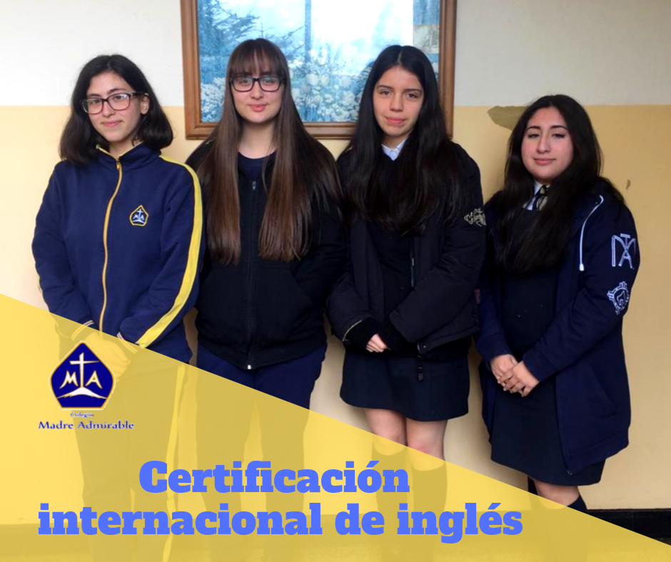 Los días viernes 04 y sábado 05 de Octubre, cinco alumnas de IV año medio rindieron prueba internacional de certificación de Inglés de la Universidad de Cambridge PET for schools. Esta oportunidad fue otorgada como un beneficio para las alumnas destacadas en la asignatura de idioma extranjero Inglés, con el fin de reconocer su buen nivel en el manejo de la lengua. A su vez, esta certificación les abrirá camino a oportunidades universitarias y laborales ya que al no tener caducidad, se pueden adjuntar al currículum personal y ocuparla para estos fines.