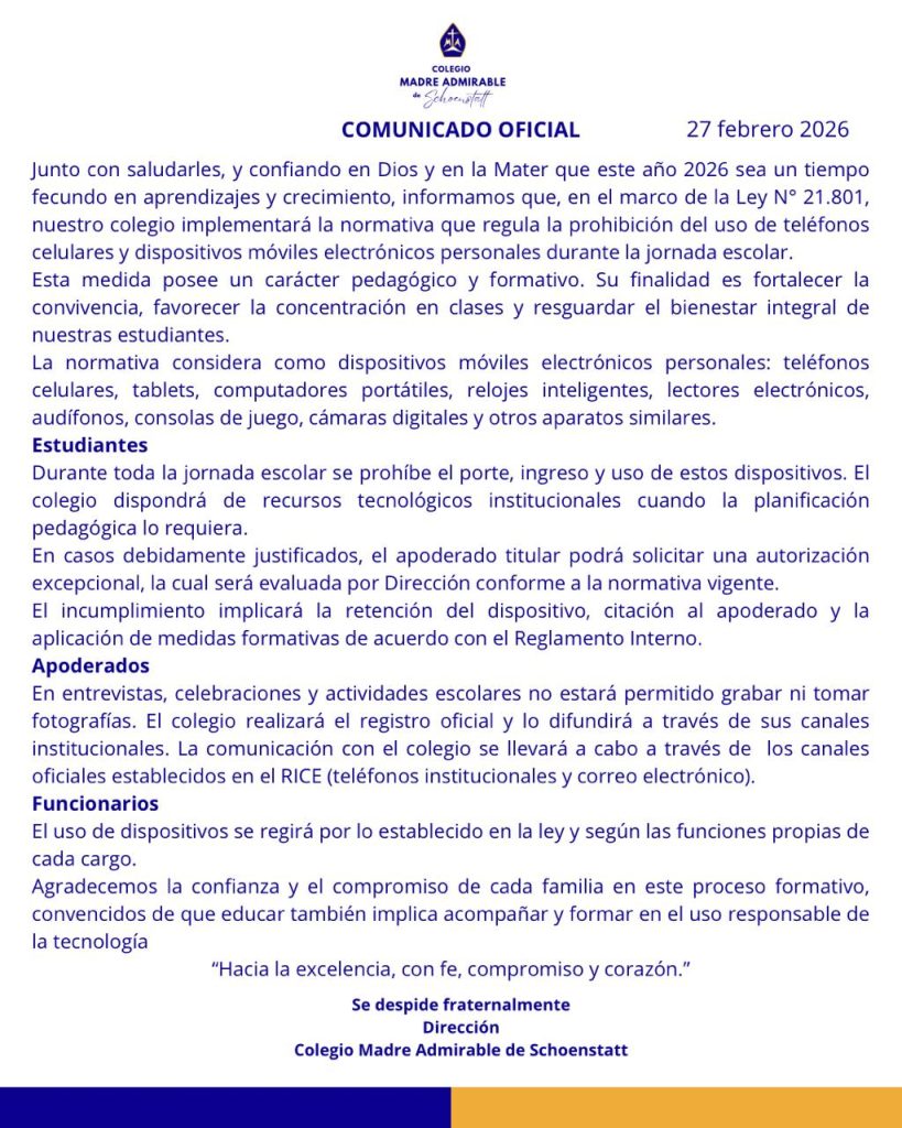 Queridas estudiantes y apoderados. El lunes 02 de marzo nos reencontraremos, luego del valioso tiempo de descanso en familia. Para retomar las actividades escolares con energía, es importante recordar lineamientos en el marco de la normativa vigente. ¡Nos vemos pronto!.