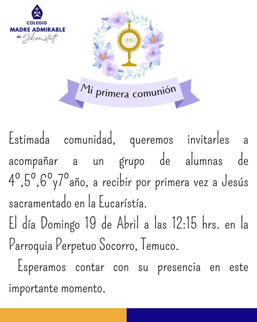 Estimada comunidad, con mucha alegría y gratitud los invitamos a ser parte de este hermoso momento en que nuestras estudiantes reciben a Jesús en su corazón.