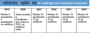 Certificación Preliminary English test (PET) de Cambridge. Prueba que da la certificación de nivel intermedio de inglés a estudiantes de IV año medio destacadas en la asignatura. Esta es financiada en su totalidad por el colegio. Siendo alrededor de 125 mil pesos por alumna seleccionada para rendir.